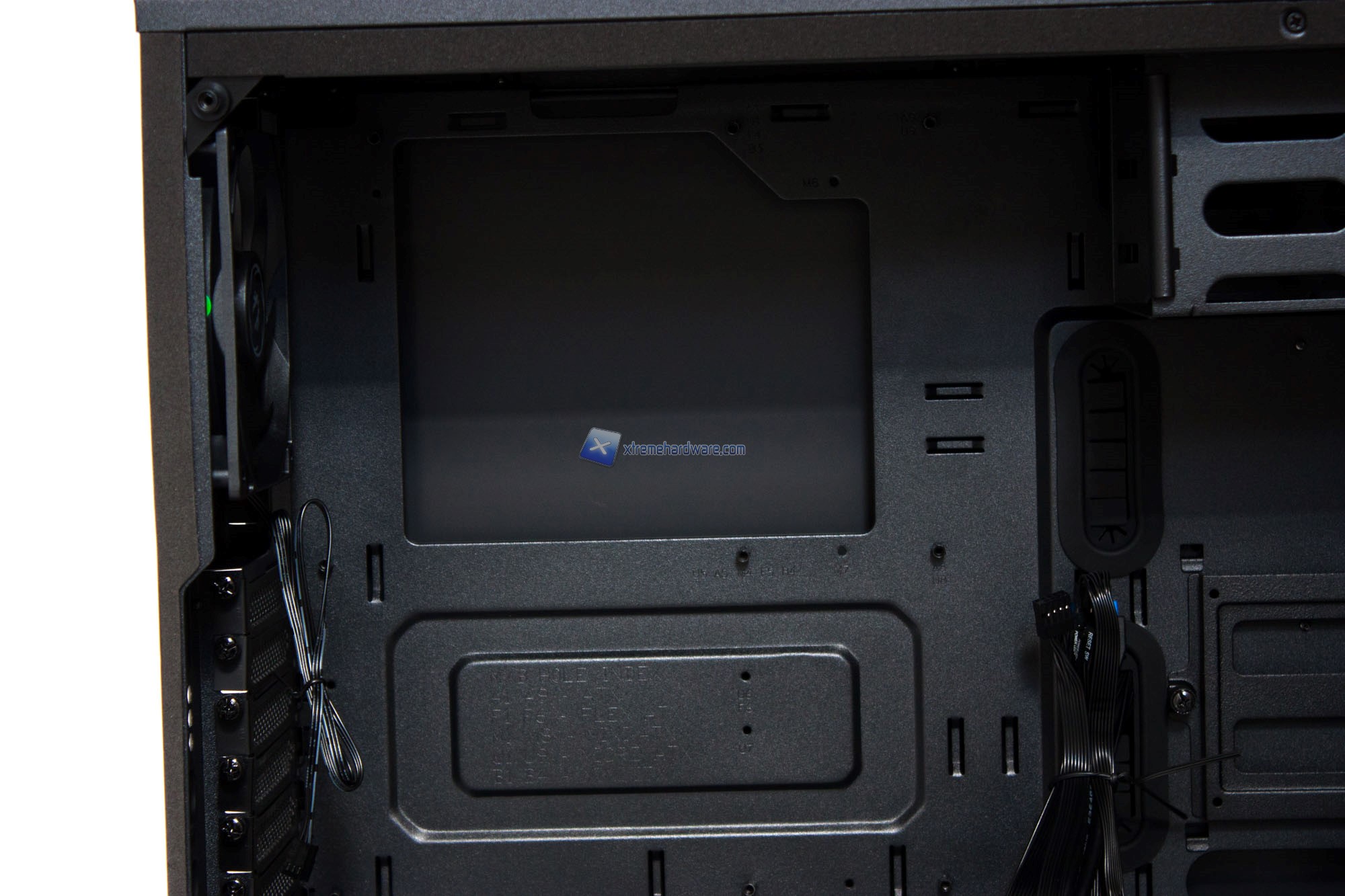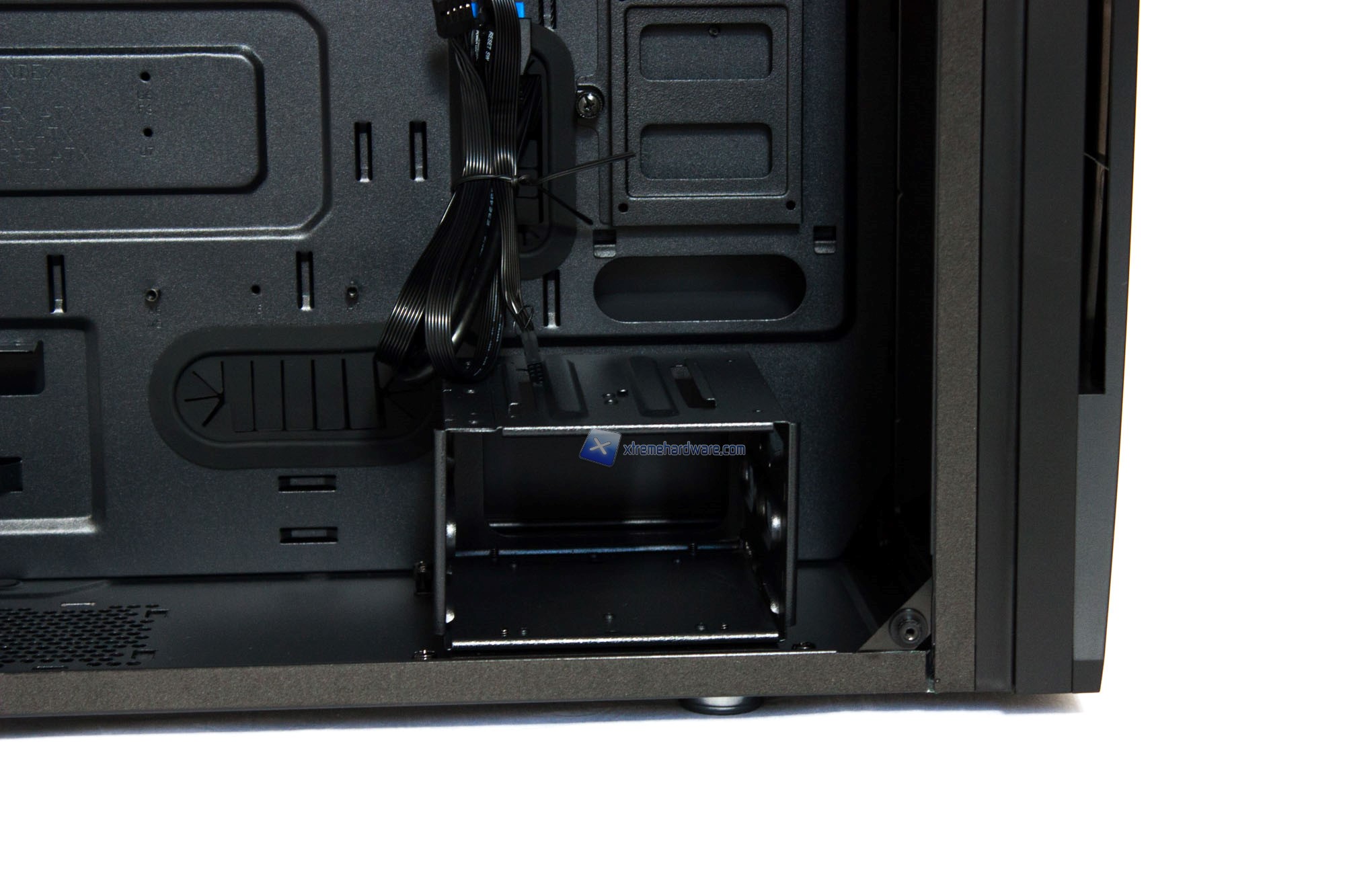 Nel lato di destra troviamo inoltre il cage per due Hard Disk da 3,5’’ (a cui applicare prima le slitte in plastica incluse nel bundle) eventualmente removibile tramite alcune viti nel fondo del case, il supporto per l’SSD quasi al centro e infine il cage per unità da 5,25’’ di cui spesso non capiamo l’utilità in case con frontale chiuso.
