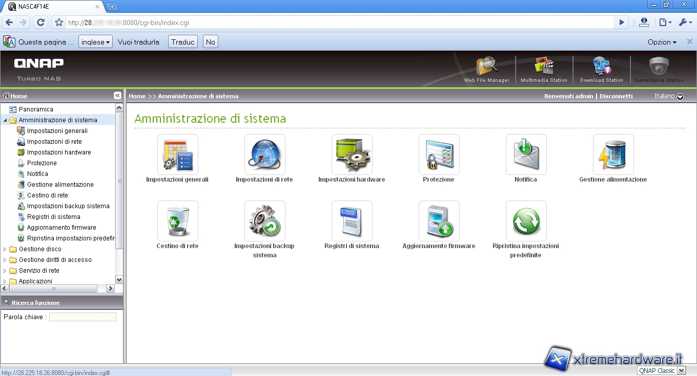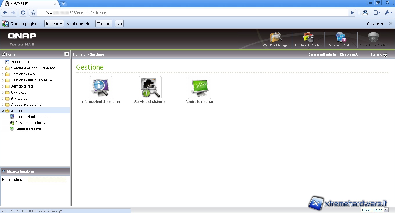 La pagina che si apre è composta da un menù laterale contenente le varie sezioni atte alla configurazione del NAS, una parte centrale che sviluppa il contenuto delle sezioni e una parte in alto che funge da scorciatoia per le operazioni più frequenti quali gestione dei file, attraverso il Web File Manager visto poco fa, l’utilizzo della Multimedia Station che vedremo tra poco, la Download Station e la stazione di sorveglianza.
